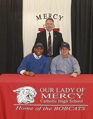 Our Lady of Mercy High School football coach Mike Earwood stands with two of the school’s football signees. Jordan Thomas, left, signed a letter of intent with The Citadel, Charleston, S.C., and Jameson Vest signed a letter of intent with the University of Toledo, Toledo, Ohio.