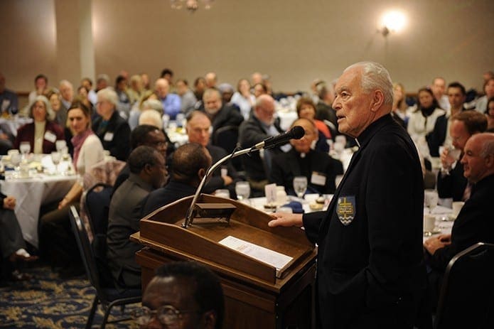Father Theodore Hesburgh, right, meets with Notre Dame alumni in Atlanta in April 1985. Father Joel Konzen, SM, is pictured with him. Georgia Bulletin File Photo