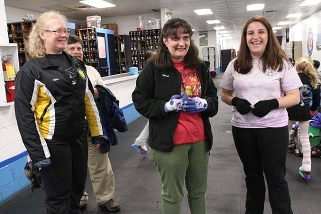 (R-l) Kristina Jespersen and her Special Olympics figure skating student, Sarah Bowman, prepare to make their way to the ice rink as Jespersen’s father Chris and Ellen Poulsen, Duluth Ice Forum skating instructor and pediatric physical therapist, look on. Photo By Michael Alexander