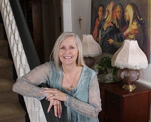 Debbie Mazur, the founder and CEO of GraceWay Recovery Residence for Women in Albany, stands in the home’s foyer. In the background, right, is an image of the Visitation of Mary. The faith-based nonprofit opened its doors in 2003. Photo By Michael Alexander