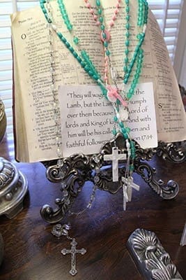 The Bible in the GraceWay chapel is open to the pages that show Psalm 79:1 through Psalm 81:3. Overlaying the pages are rosaries and a verse from Revelation 17:14, which falls under the heading, “Victory for the Lamb.” Photo By Michael Alexander