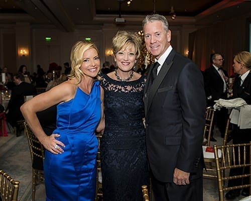Jill Becker, center, was honored May 16 at the Believe Ball to benefit CURE Childhood Cancer. Tom and Chris Glavine, who were honored in 2014, were among the hosts of the 2015 ball. Becker, whose son survived childhood cancer, has worked with CURE for over 20 years. Photo By Lynn Crow