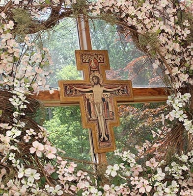 As a sign of the Franciscan presence, a San Damiano cross hangs behind the altar in the day chapel at Holy Cross Church in Atlanta. Photo By Michael Alexander