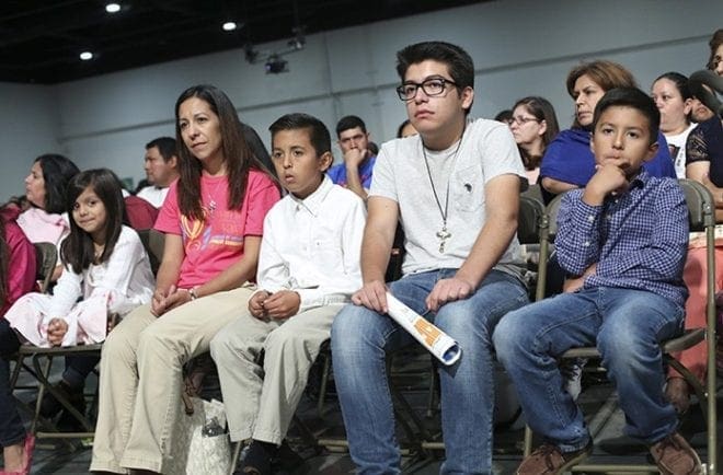 Elizabeth Aceves, second from left, from St. Catherine of Siena Church, Kennesaw, and her family, listen to the Spanish track speaker. Her children include (l-r) Sophia, 7, Daniel, 12, Luis David, 15 and Nicolas, 8. Photo By Michael Alexander