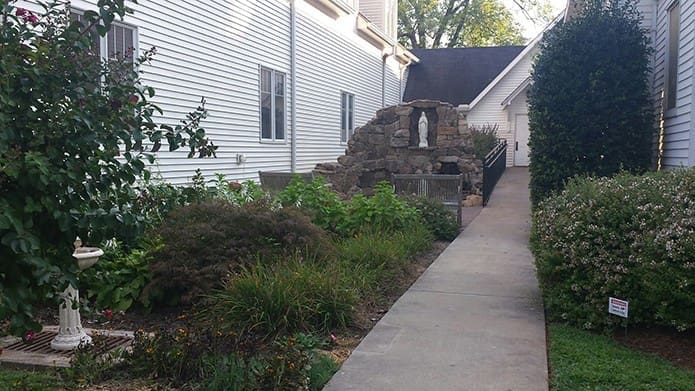The grotto of Our Lady of Lourdes at Dahlonega’s St. Luke the Evangelist Church is nestled between the church sanctuary building and the parish hall. It features statues of Mary and St. Bernadette, engraved memorial pavers, and a water feature. Water from Lourdes, France, was poured into the stream of the parish grotto at its recent dedication. Photo By Nichole Golden