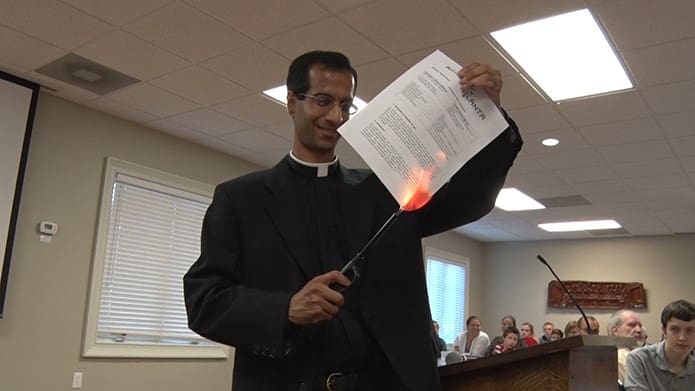 Father Neil Dhabliwala, pastor of St. Luke the Evangelist Church in Dahlonega, burns the mortgage on the parish hall built in 2008 at a special celebratory dinner Aug. 15. Through a capital campaign, led by parishioners, the parish was able to retire the debt of $750,000 ahead of schedule. Photo By Allen Kinzly