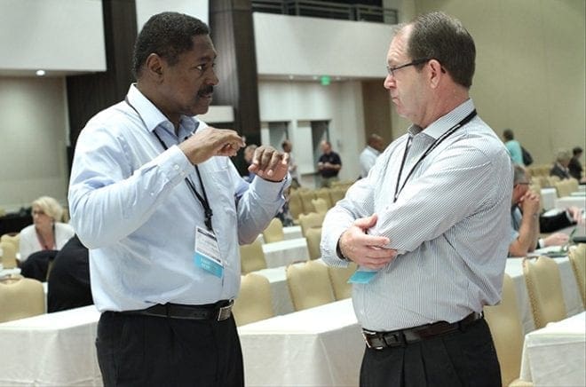 Warren Bush, left, chief financial officer for the Diocese of St. Thomas in the Virgin Islands, speaks with Steve McKay, chief financial officer for the Diocese of San Angelo in Texas, about some of the approaches that have worked in his diocese in the area of fiscal management. Photo By Michael Alexander