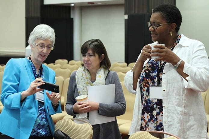 (L-r) Laura Clark, chief financial officer for the Diocese of San Bernardino in California, Bobbi Hanningan, manager of diocesan initiatives for Catholic Extension in Chicago, and Ursula Hinkson, associate director of financial affairs for the Diocese of San Bernardino, converse over a break between general sessions during the annual meeting of the Diocesan Fiscal Management Conference at the Hyatt Regency Atlanta hotel. Photo By Michael Alexander