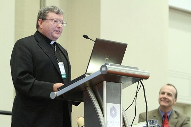 Msgr. William King of the Diocese of Harrisburg, Pennsylvania, former judicial vicar for Atlanta, was among the presenters. Msgr. King reviewed the findings of a 2014 survey by the Canon Law Society of the functioning of finance councils.
