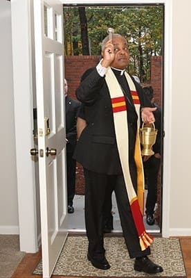 Archbishop Wilton D. Gregory sprinkles holy water in the foyer of one of the four units that make up the St. Charles Borromeo House, Atlanta. Photo By Michael Alexander