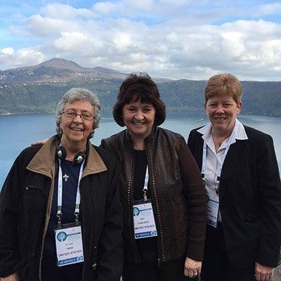 Superintendent of Schools for the Archdiocese of Atlanta Diane Starkovich, center, visits with Sister Carol Cimino, superintendent of schools for the Diocese of Buffalo, New York, at left, and Susan Murphy, superintendent of schools for the Archdiocese of Santa Fe, New Mexico, at Castel Gandolfo, the pope’s traditional summer residence. They were among 2,000 educators participating in the World Congress on Catholic Education in Rome Nov. 18-21.