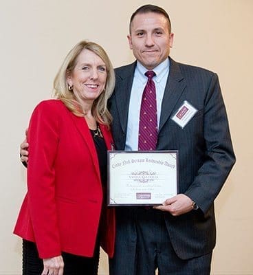 Cindy Nofi, left, stands with Xavier Balderas, winner of the Cindy Nofi Servant Leadership Award, at the Jan. 14 graduation ceremony for the 2015 Catholic Charities Atlanta Leadership Class. The award recognizes the class member who possesses a deep spirituality, is dedicated to helping others and has a true commitment to the program. Photo By Allison Shirreffs