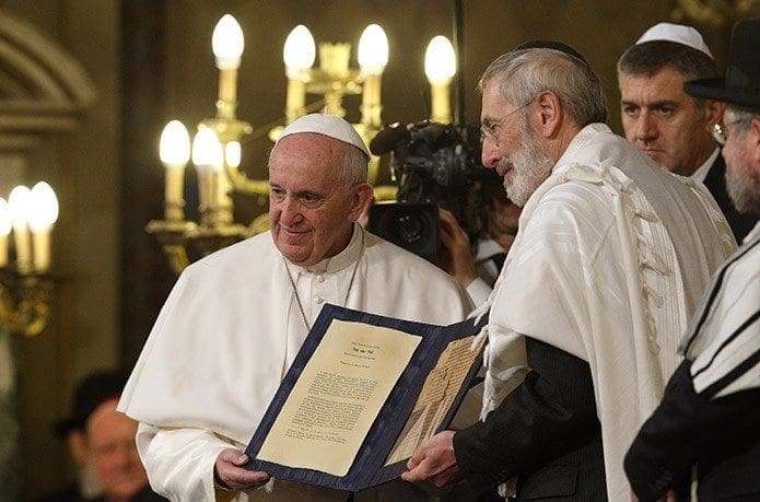 The pope, the rabbi, the president of the Rome Jewish community and the president of the Union of Italian Jewish Communities all recalled the visits of St. John Paul II in 1986 and of Pope Benedict XVI in 2010. And they all spoke of the “new era” in Catholic-Jewish relations that began with the Second Vatican Council and its declaration “Nostra Aetate” on relations with non-Christian religions.
