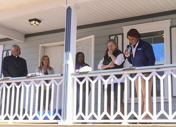 (Right to left) Lisa Y. Gordon, president and CEO of Atlanta Habitat for Humanity, shares some remarks from the front porch of the home during the Jan. 30 dedication as Dana Halberg, Atlanta Habitat for Humanity board member, Kiaira Dotson, the homeowner, Heather Dexter, CEO of Emory Saint Joseph’s Hospital, and Archbishop Wilton D. Gregory look on. Photo By Michael Alexander