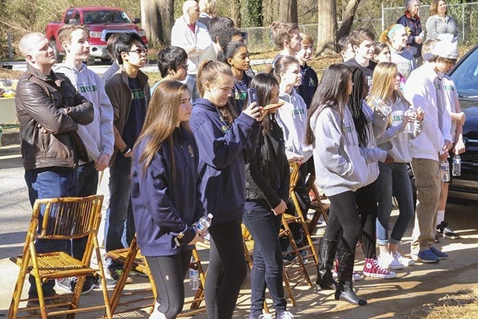 Freshman students from Notre Dame Academy High School, Duluth, and teacher John Henry Spann, back row, left, attend the Jan. 30 Atlanta Habitat home dedication in honor of Pope Francis. They also came the first weekend of the build and provided lunch for the volunteers. Photo By Michael Alexander