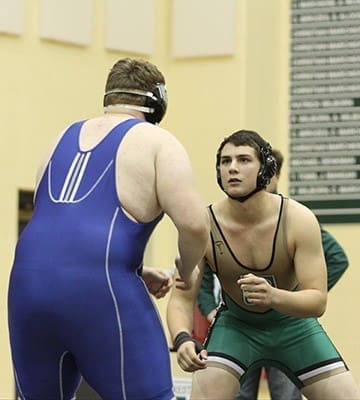 Pinecrest Academy senior Gabe Underwood, facing camera, wrestled at the highest weight class of 285 pounds against competitors who were 40-70 pounds heavier in order to fill that void for the team. Photo By Michael Alexander