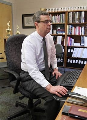 Staring at his computer screen, Blessed Trinity High School principal Frank Moore looks over the morning announcements for April 19 as he prepares to print them. Photo By Michael Alexander