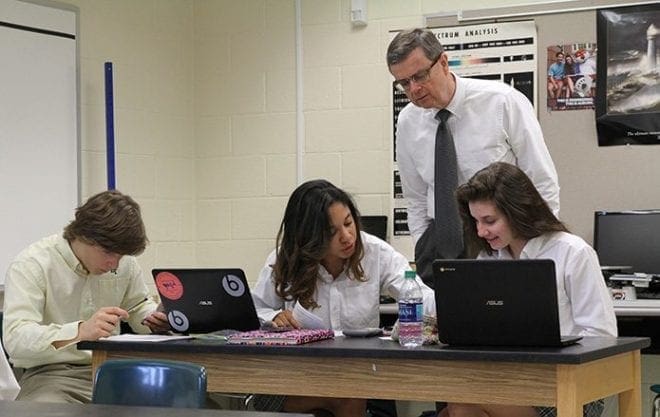 As Blessed Trinity High School principal Frank Moore walks the building one April morning, he pops in on Chad Johnson’s physics class. Here he peers over the shoulders of juniors (l-r) Joseph Brinsmaid, Ania Trichet and Meredith Franchi. It’s one of the many activities Moore squeezes into his jam-packed daily schedule. Photo By Michael Alexander