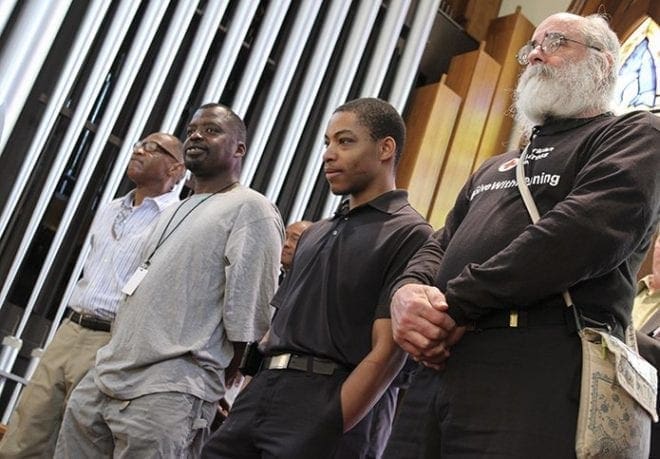 Members of the Homeward Choir, who are night shelter guests, sing the preparation hymn, “What You Have Done.” Singing along the front row are (r-l) Damian Whitaker, Bryant Allen, John Cox and Alfonza Dorsey. Andrew Freeman was the soloist on the song. Photo By Michael Alexander