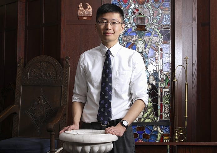 Holy Spirit Preparatory senior Tom Yao stands before the baptismal font in the school’s St. Joseph Oratory, where he converted to Catholicism last year. Photo By Michael Alexander