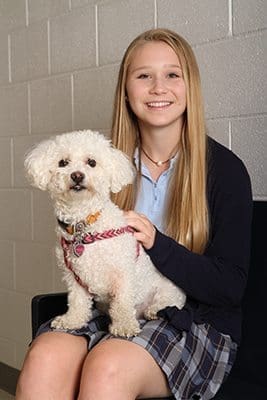 With all the extracurricular activities Krunkosky participated in, Monsignor Donovan High School senior Rachel Krunkosky found time for community service like volunteering at the Athens Area Humane Society. Krunkosky was inspired by her older sister and their father, a veterinarian and associate professor at UGA’s College of Veterinary Medicine. Here Krunkosky poses with the family dog Dessi, a bichon poodle. Photo By Michael Alexander