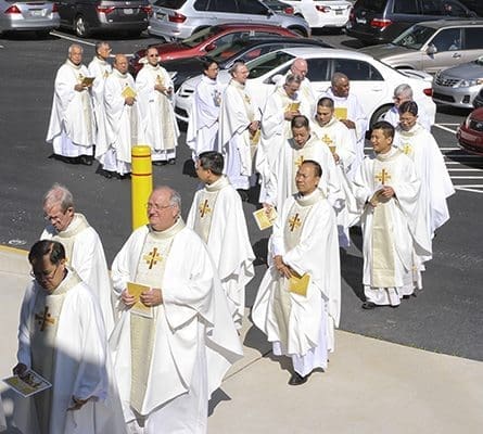 Nearly 30 priests process into Our Lady of Vietnam Church, Riverdale, for the Mass marking the 50th anniversary of Msgr. Francis Pham Van Phuong’s ordination to the priesthood. Photo By Michael Alexander
