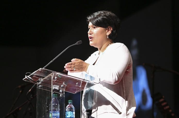 Ramona Treviño, a former Planned Parenthood employee, who now serves as a spokeswoman for 40 Days for Life in Dallas, speaks to a large audience during an afternoon session in the Spanish track. Photo By Michael Alexander