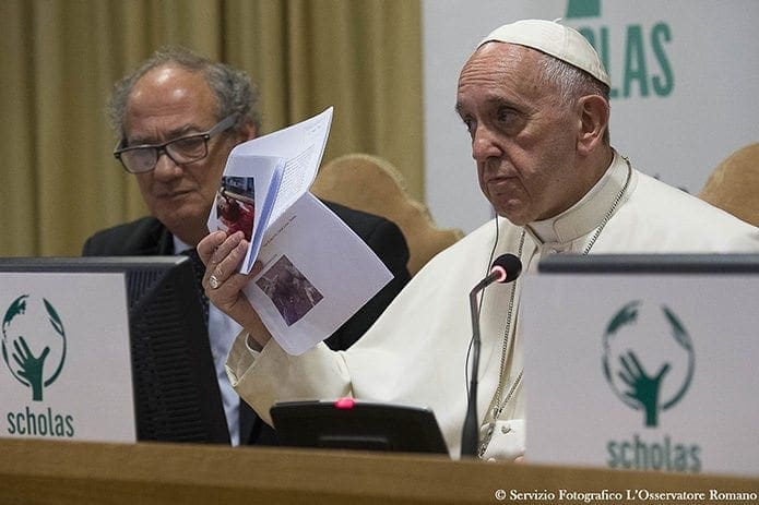 “The level of aggressiveness in our world needs to be dialed down. (The world) needs tenderness, meekness, (people) listening and walking together,” he told them and others taking part in a world congress sponsored by Scholas Occurrentes.
