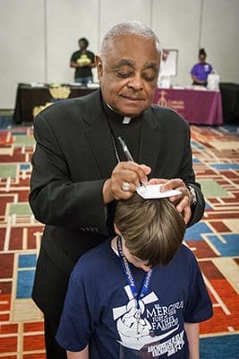 Archbishop Wilton D. Gregory uses the head of a young autograph seeker to sign his name during day two of the Eucharistic Congress. Photo By Thomas Spink