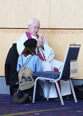 Father James Harrison, pastor of St. Marguerite d’Youville Church, Lawrenceville, hears the confession of a young woman during the Eucharistic Congress. Photo By Michael Alexander