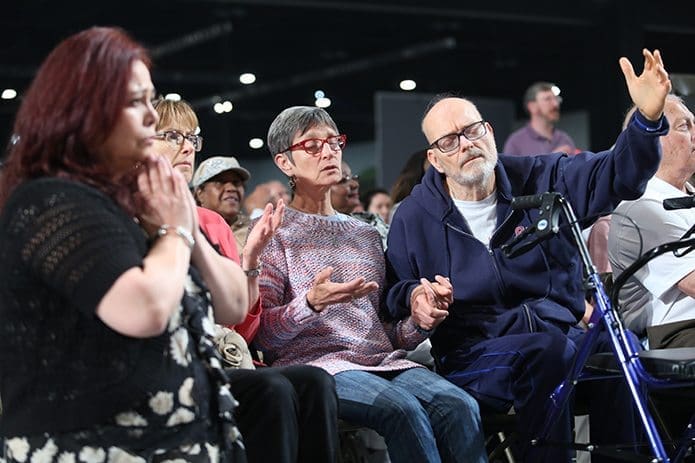 (L-r) Ann Benavides of St. Benedict Church, Johns Creek, and Kathy Bryan and Elaine and Dave Slezak from Church of St. Ann, Marietta, praise the Lord during the post communion hymn, “Holy Spirit.” This Mass concluded the congress June 4. Photo By Michael Alexander