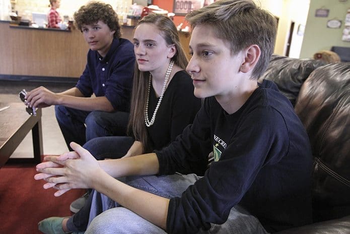 (Foregound to background) David Boudreaux, Lizzie Laegen and Karston Hopson were three of the high school thespians that performed in a skit surrounding the theme, “How to keep your light lit,” during the May 1 EPIC. Photo By Michael Alexander