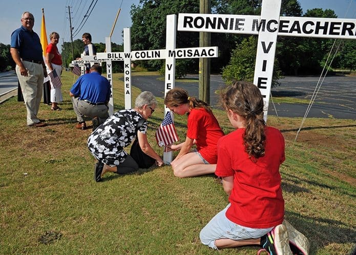 CONYERS—A row of white crosses and American flags along the edge of St. Pius X Church property reminded passing drivers and parishioners of the sacrifices of veterans on July 4.