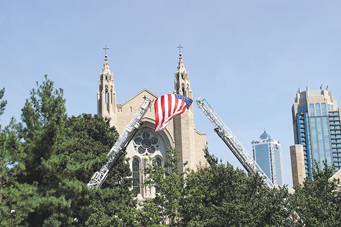 Aerial ladders from Atlanta Fire Rescue companies raise the American flag outside the Cathedral of Christ the King, Atlanta, on Friday, Sept. 9. The Blue Mass was celebrated by Archbishop Wilton D. Gregory for first responders. Photo By David Pace
