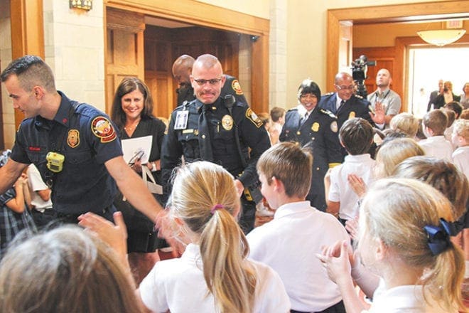 Atlanta firefighters and police department personnel receive cheers, applause and high-fives from Christ the King School students after the Blue Mass celebrated at the cathedral Sept. 9. Photo By David Pace