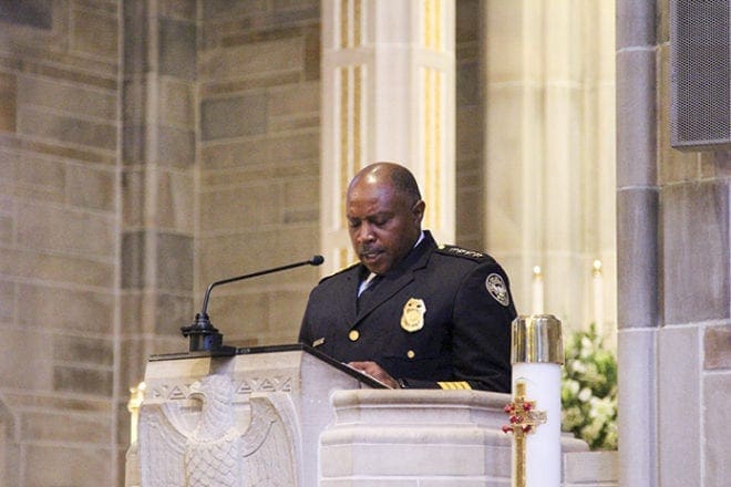 Atlanta Police Chief George N. Turner speaks to the congregation at the conclusion of the Blue Mass at the Cathedral of Christ the King. This was the second annual Blue Mass in the Atlanta Archdiocese. Photo By David Pace