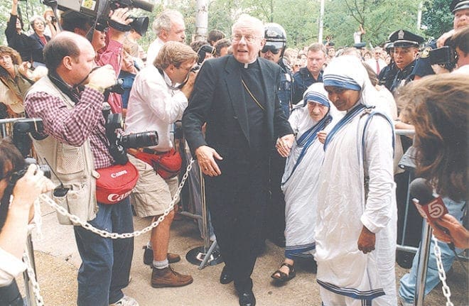 Archbishop John F. Donoghue leads Mother Teresa into Sacred Heart Church, Atlanta, on June 12, 1995. The foundress of the Missionaries of Charity came to dedicate the Gift of Grace House to serve homeless women with AIDS. An estimated 1,500 people filled the church and streets outside to see her and hear her words. Photo By Linda Schaefer/Archdiocese of Atlanta