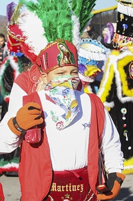Before the procession for the Our Lady of Guadalupe festival at Heritage Point Park in Dalton gets underway, Anthony Martinez, 12, tries to stay warm under frigid conditions by performing with the St. Joseph Church dance troupe among the crowd. Photo By Michael Alexander