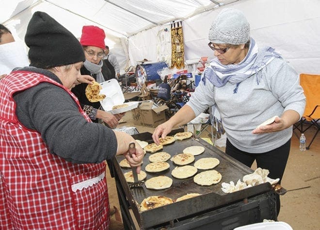Standing under a food tent (foreground, left to right) Evita Ortega and Dora Sofia Valle prepare pupusas, a food item traditional to El Salvador, which consist of a corn tortilla with a filling of cheese, beans or pork. Photo By Michael Alexander