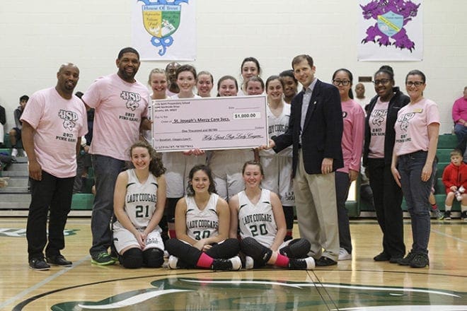 Prior to the boys’ Jan. 20 game the Holy Spirit Lady Cougars basketball team, hosted its sixth annual Cougars Care Pink basketball game to benefit Mercy Care, Atlanta.