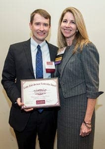Ryan Johnson received the Cindy Nofi Servant Leadership Award at the annual Catholic Charities Leadership Class graduation Jan. 19. Johnson, left, a parishioner at St. Ann Church, Marietta, poses with Jennifer Daniels, chair of the group’s steering committee.