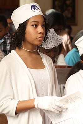 Fifteen-year-old Colby Johnson of Most Blessed Sacrament Church, Atlanta, joins fellow Junior Daughters of the Knights of Peter Claver in a side pew during the Martin Luther King Jr. Eucharistic Celebration. Photo By Michael Alexander