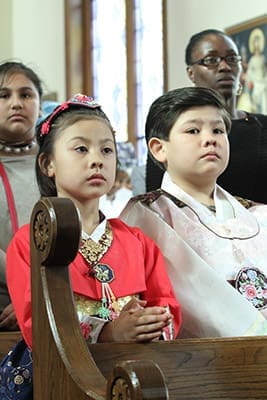 Athena Yum, left, and her older brother, Max, stand during the Jan. 14 Martin Luther King Jr. Eucharistic Celebration at the Shrine of the Immaculate Conception, Atlanta. The siblings attend St. Andrew Kim Church in Duluth. Photo By Michael Alexander