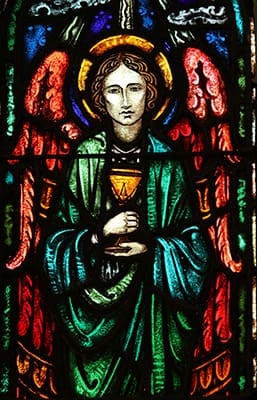 This stained glass image of an angel holding a chalice is one of the four smaller windows at St. Joseph Church, Athens, that Foothill Sand To Glass company came back to remove the week of Jan. 15. The church’s stained glass windows date back to 1909. Photo By Michael Alexander