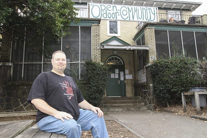 David Payne, 50, sits on a bench in front of the Open Door Community’s building at 910 Ponce de Leon Ave., NE, in Atlanta. Payne, a Long Island, N.Y., native who has been a resident volunteer for three years, will move to Baltimore, Md., with founders Murphy Davis and Eduard Loring when the Open Door Community closes this month. Photo By Michael Alexander
