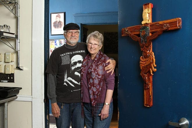 Eduard Loring and his wife, Murphy Davis, stand at the threshold of a room that served as the center of activity at the Open Door Community, a ministry they cofounded in 1981. Hanging on the door beside them is a crucifix entitled “Convict Christ,” made by a Louisiana State Penitentiary at Angola inmate. Loring and Davis are moving to Baltimore, Md., when the Open Door Community closes this month. Photo By Michael Alexander