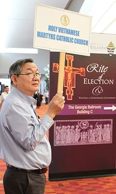 Binh Tran holds up a sign, just outside the Georgia World Congress Center’s Georgia Ballroom, bearing his parish’s name so that candidates, catechumens and sponsors can be directed to the Holy Vietnamese Martyrs Church seating area. Photo By Michael Alexander