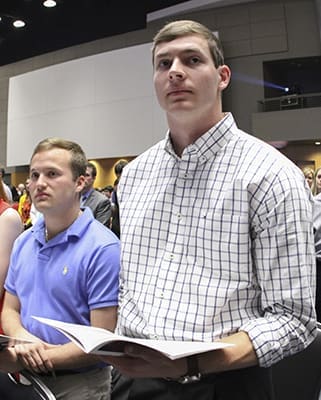 Third-year Georgia Tech mechanical engineering student Zach Matthews, right, stands with his sponsor, Jonathan Edwards, a fourth-year industrial engineering major, during the presentation of the candidates. Photo By Michael Alexander