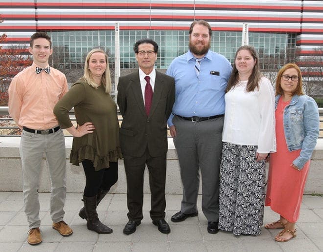 Derrick Li of St. Mary Church, Toccoa, third from left, is the only catechumen among the candidates from St. Catherine Laboure Church, Jefferson, and St. Mary. They include (l-r) Noah Parker, Amanda Harvin, Kyle and Ashley Wood and Maria Chavez from his parish. Photo By Michael Alexander