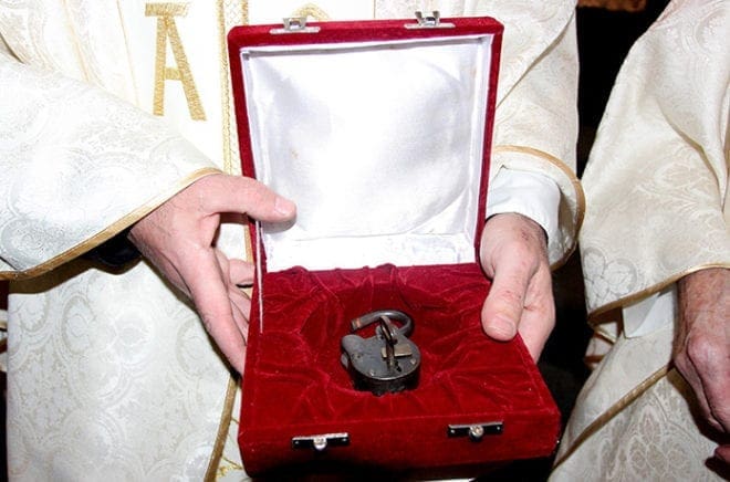 This antique padlock was used to lock the doors of the church, which was dedicated in this location in downtown Athens in 1913. The church building will be sold as the parish completes its move to a larger space on Epps Bridge Parkway. Photo By Sally Gustafson